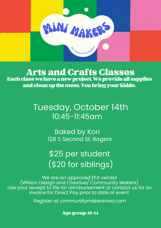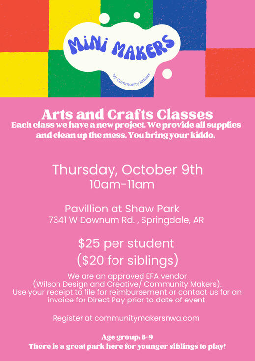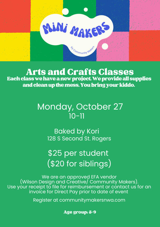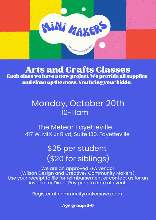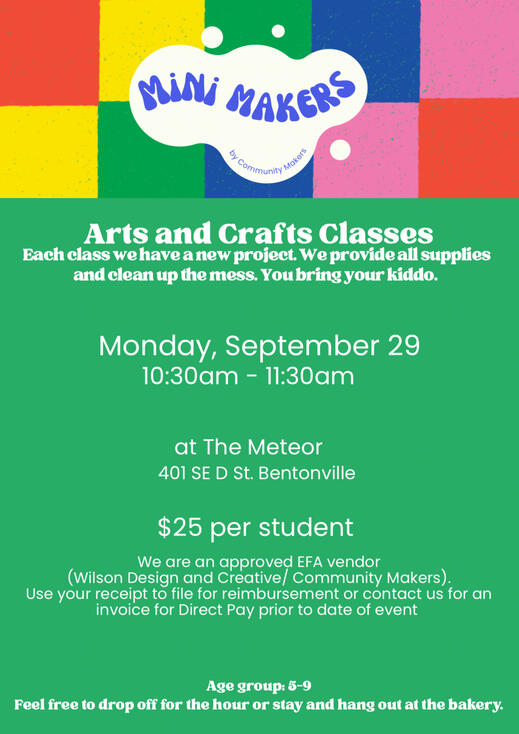 We are pleased to offer 5 classes for $100. You can select any Mini Makers class at any location with a 2 business day notice. Valid from September 2025 to May 2026. Register at the link below.